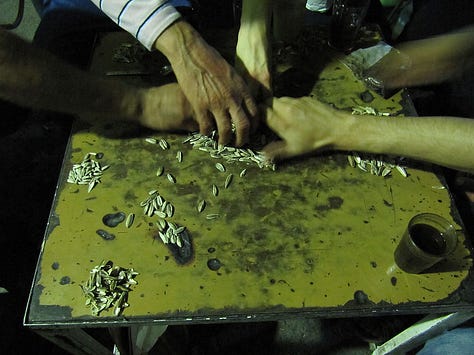 In Turkish there is a saying ‘çekirdek çitlemek izlemek’, which translates to ‘watching something while eating seeds’. My friend Berkok dropped me a seven minute WhatsApp voice note — which you must listen to above — to explain the onomatopaeic origin of çitlemek, and why eating sunflower seeds is sometimes dubbed fakir kokaini, ‘the poor man’s cocaine’. Sunflower seeds are more beloved than their tastier pumpkin counterparts because, as Berkok observes, ‘the visceral experience of the salty, crunchy texture and getting that little seedling’ is much more gratifying. In other words, the extraction of pleasure — or perhaps the pleasure of extraction — is a key reason to eat seeds.