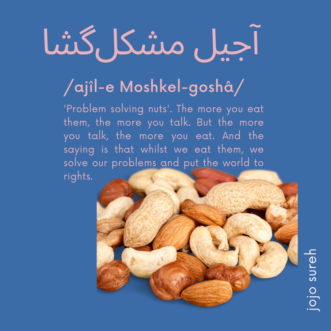 One of my favourite [sayings] is ‘ajîl-e Moshkel-goshâ’ (‘problem solving nuts’). I always integrate this into our supper clubs. You have nuts, dates, apricots, dried melon seeds. The more you eat them, the more you talk. But the more you talk, the more you eat. And the saying is that whilst we eat them, we solve our problems and put the world to rights.