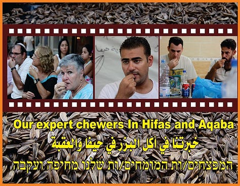 In 2012, Israeli artist Noam Edry embarked on Seeds Of Bliss — גרעינים – بذر, an ongoing interactive event that took place in neighbouring Middle Eastern cities: Aqaba and Eilat, Nablus and Haifa, Bethlehem and Umm El Fahm, Jenin and Afula. Edry invited the general public to travel to these locations to chew sunflower seeds with their neighbours. Her aim for her participants was to altogether chew 10 tonnes of sunflower seeds, spitting the shells on the ground to form a giant heap that would then be exhibited in London.